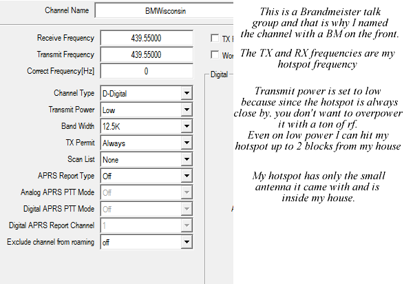 Now let's setup a hotspot channel. But first, what is a hotspot. It is a small device that allows you to connect to the internet and then access DMR talkgroups via Brandmeister. Below is my talkgroup lists and you'll notice quite a few have BM in front of the name. That is just to let me know that when I make a channel it will be going to my hotspot. Hotspots also are simplex so TX and RX will be the same. I won't go into setting the hotspot up but will cover it in a later course.