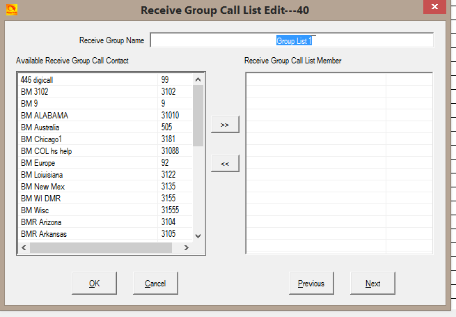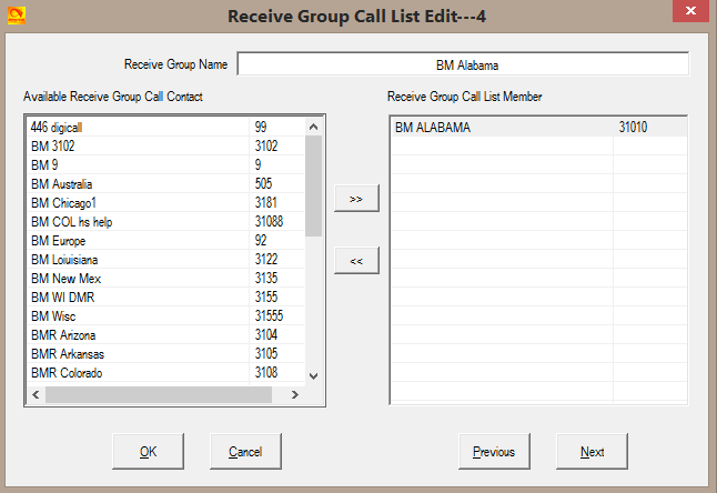 All your talk groups will show in the left column. In the receive group name give the receive group the same name, to keep it easy to remember. Then highlight the one you want to move and click the >> arrows. Click OK and you created your first receive group. Do this for each talkgroup you have. For this example we'll setup receive group BM ALABAMA and it will then look like the below image.